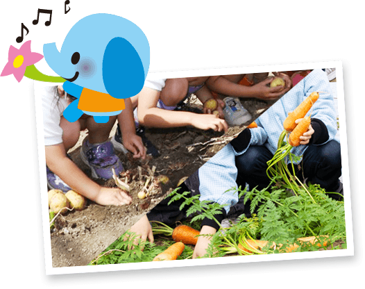 園児は、さつま芋、玉葱、じゃが芋、トマト、大根、人参等の収穫などの体験をし、自然と触れ合う体験をしています。収穫した野菜は毎日の給食で頂き、強い身体作りをしています。